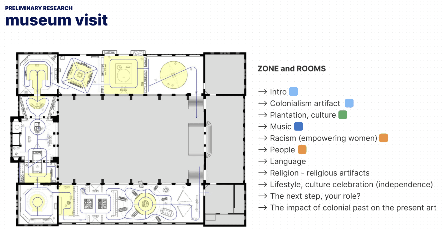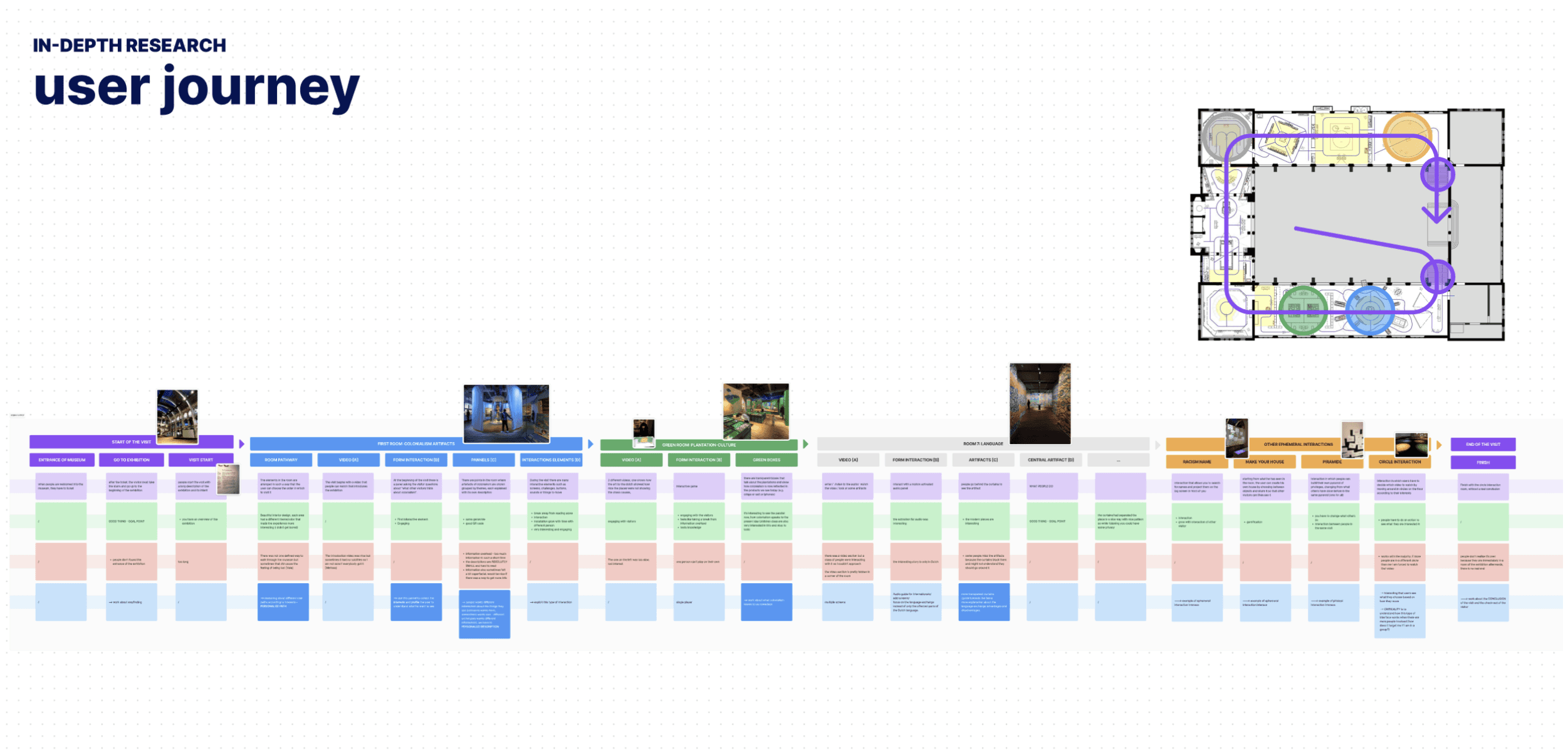 Mapped detailed visitor journeys, highlighting critical pain points such as information overload, insufficient engagement for children, and uniform visitor paths that neglect personal interests.