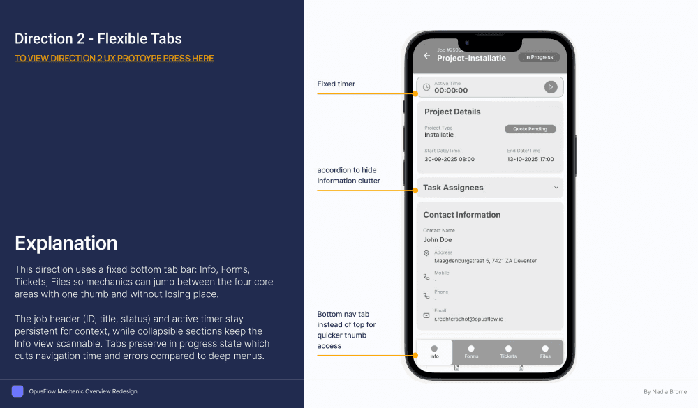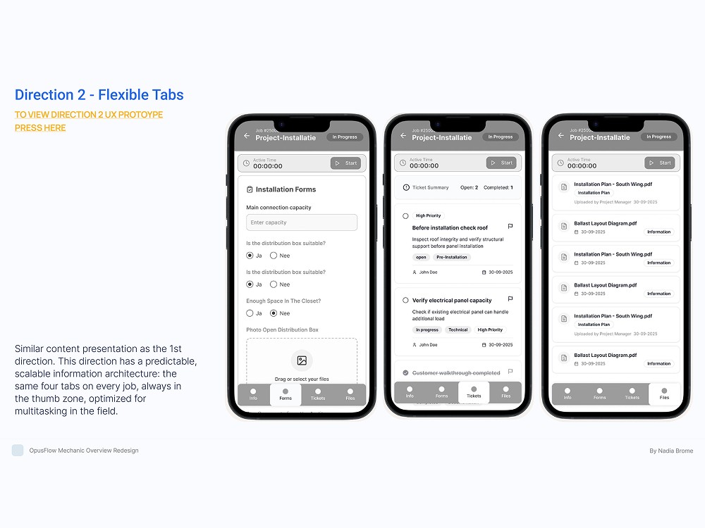 Redesigned the OpusFlow mechanic overview to improve task clarity, reduce cognitive load, and support faster job completion in the field. The solution introduced a clearer information hierarchy, action-focused flows, and mobile-first ergonomics, helping technicians better understand progress, priorities, and next steps during installations.
